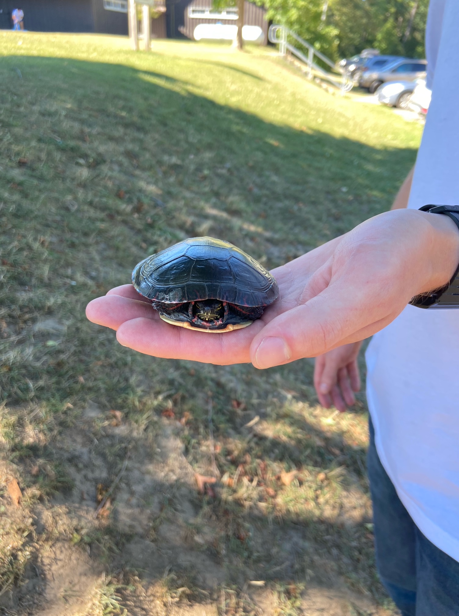 I also saw the tail of a salamander hanging out near the vernal pools, we saw two birds – one was a bird of prey, the other may have been a corvid or woodpecker but I can’t be sure, then a little grey squirrel, chipmunks, and a beautiful little painted turtle. Some kids found the young turtle in the parking lot while we were leaving and opted to move it out of the road but the paths around the lot were quite busy. We couldn’t leave it there and its shell was hot as can be so we brought the little buddy over to the lake since there wasn’t much safe area near the lot and we didn’t know which way they were headed.